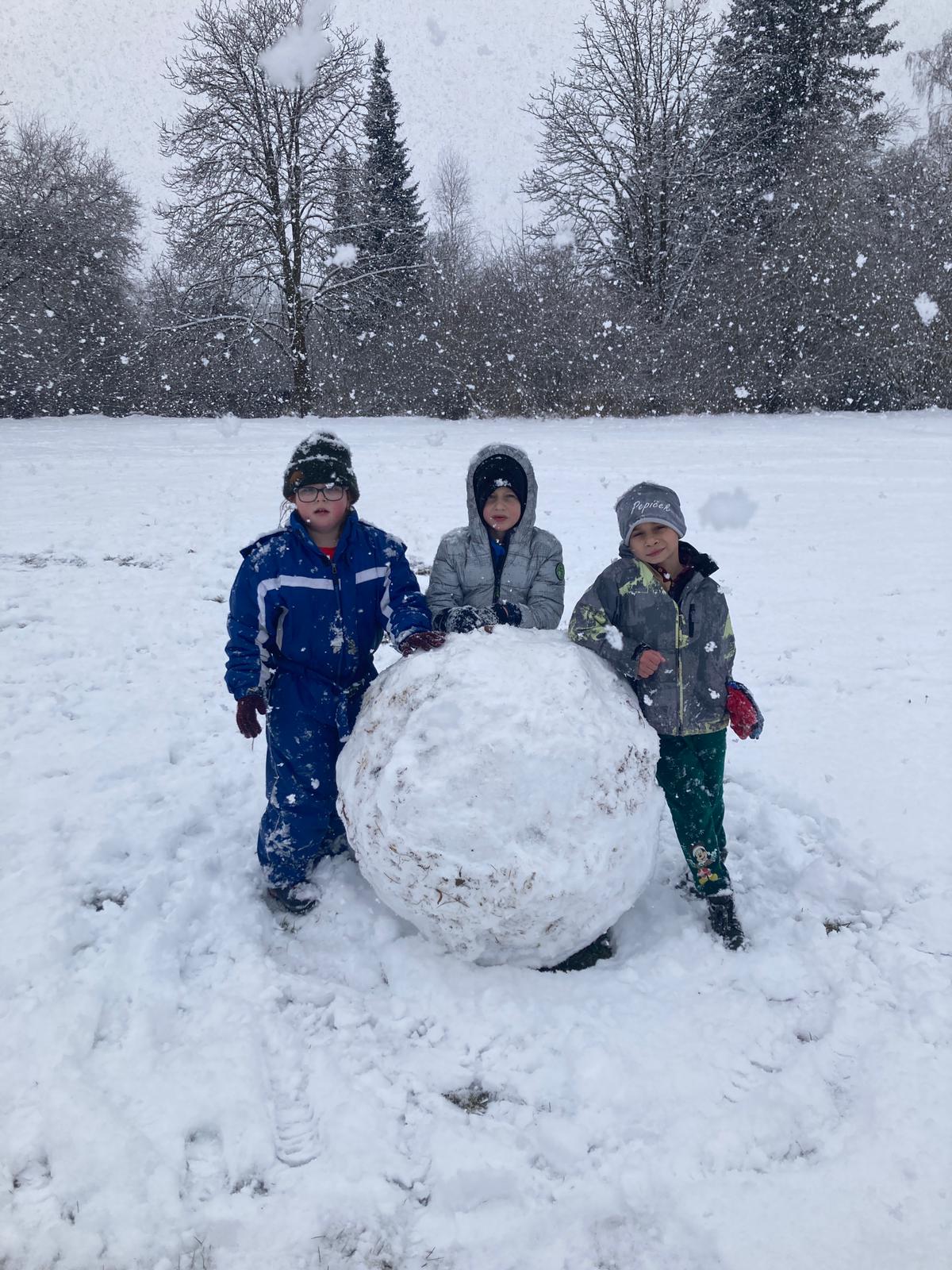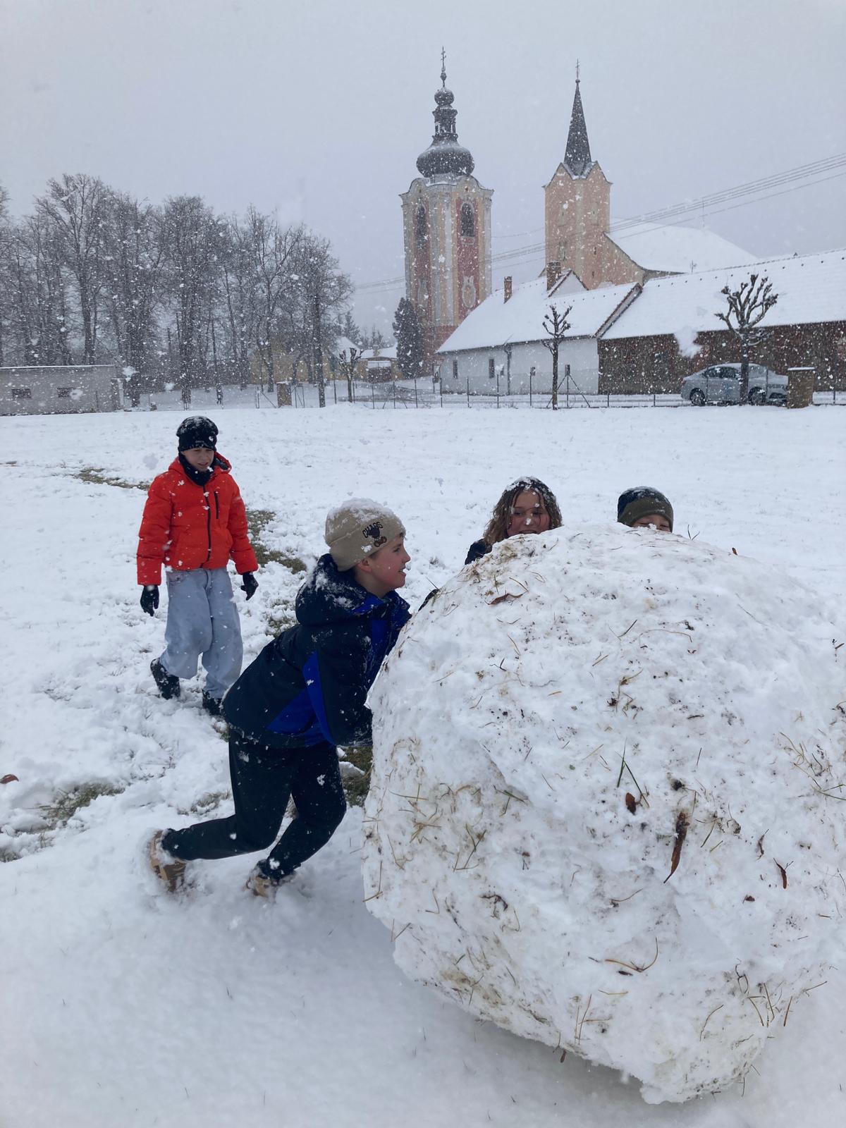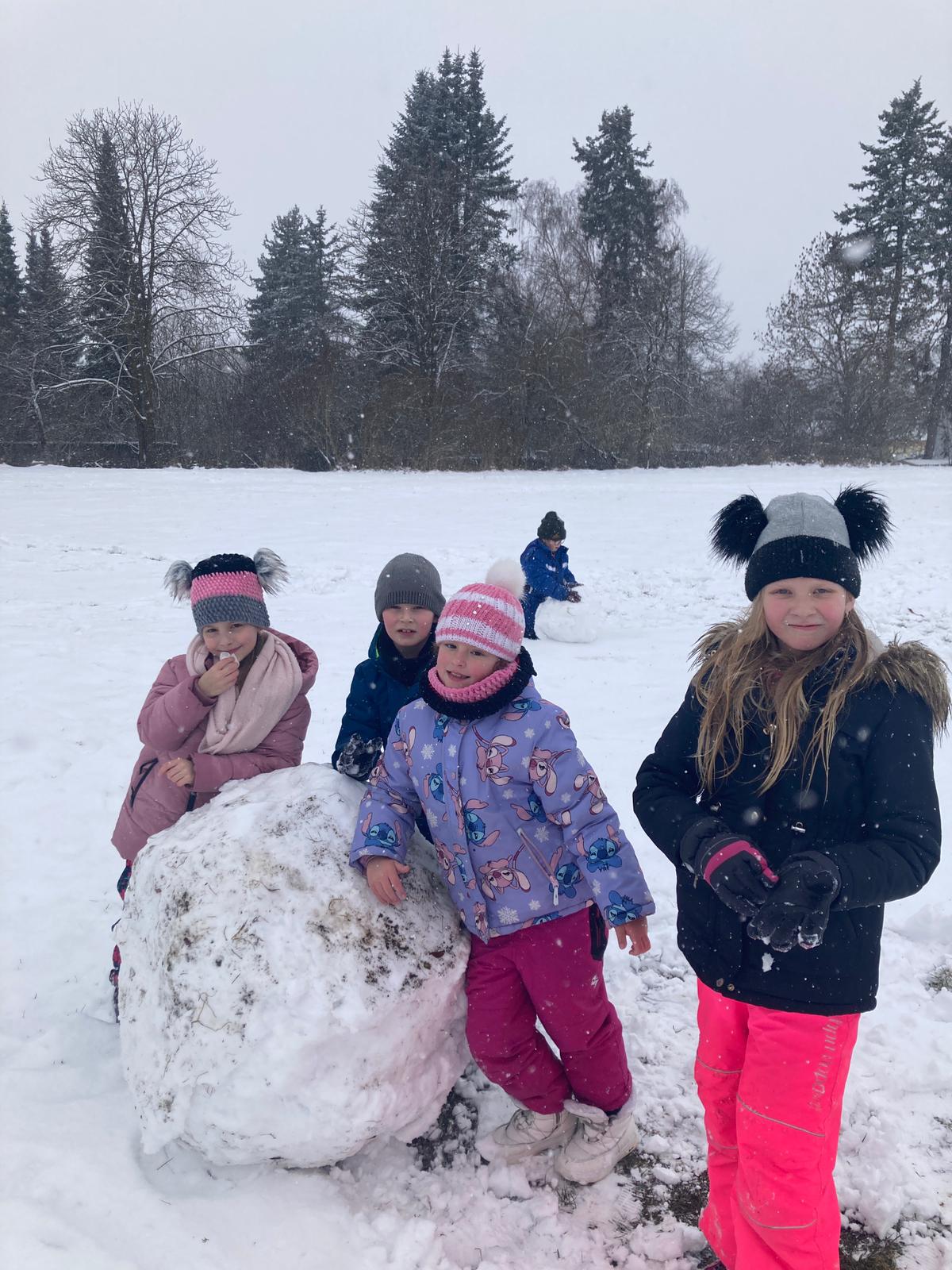 V uplynulých dnech nám počasí přálo a školní zahradu i hřiště pokryla bohatá sněhová nadílka. Děti ze školní družiny proto neváhaly a vydaly se ven užít si pravou zimní atmosféru. Hlavní zábavou se stalo vyrábění obřích sněhových koulí.